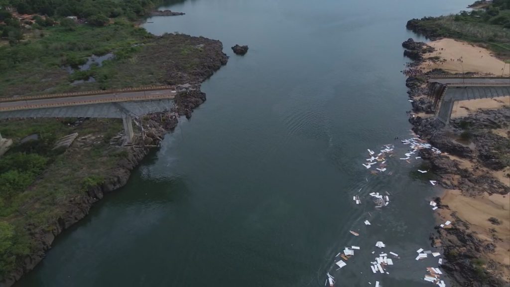 Passagem pelo trecho da BR-226, entre Aguiarnópolis (TO) e Estreito (MA) foi suspensa após a queda da ponte JK. Serviço será realizado pela empresa de balsas, Pipes Navegações. Vista aérea de ponte que desabou entre MA e TO